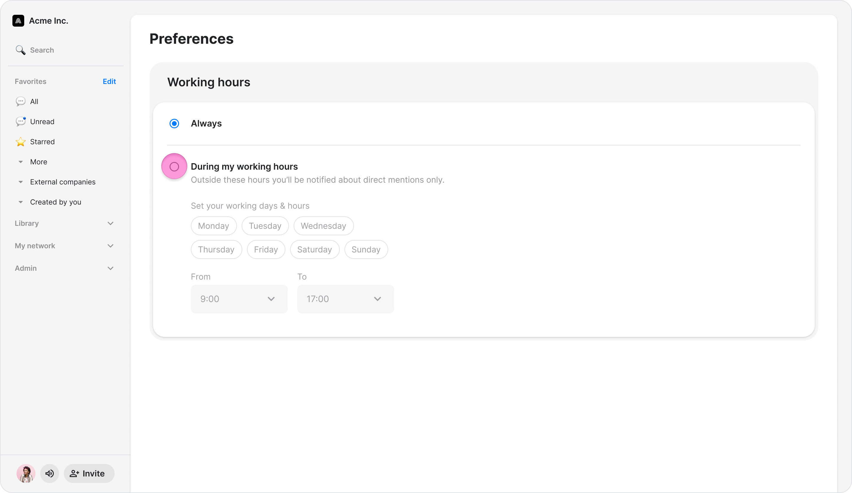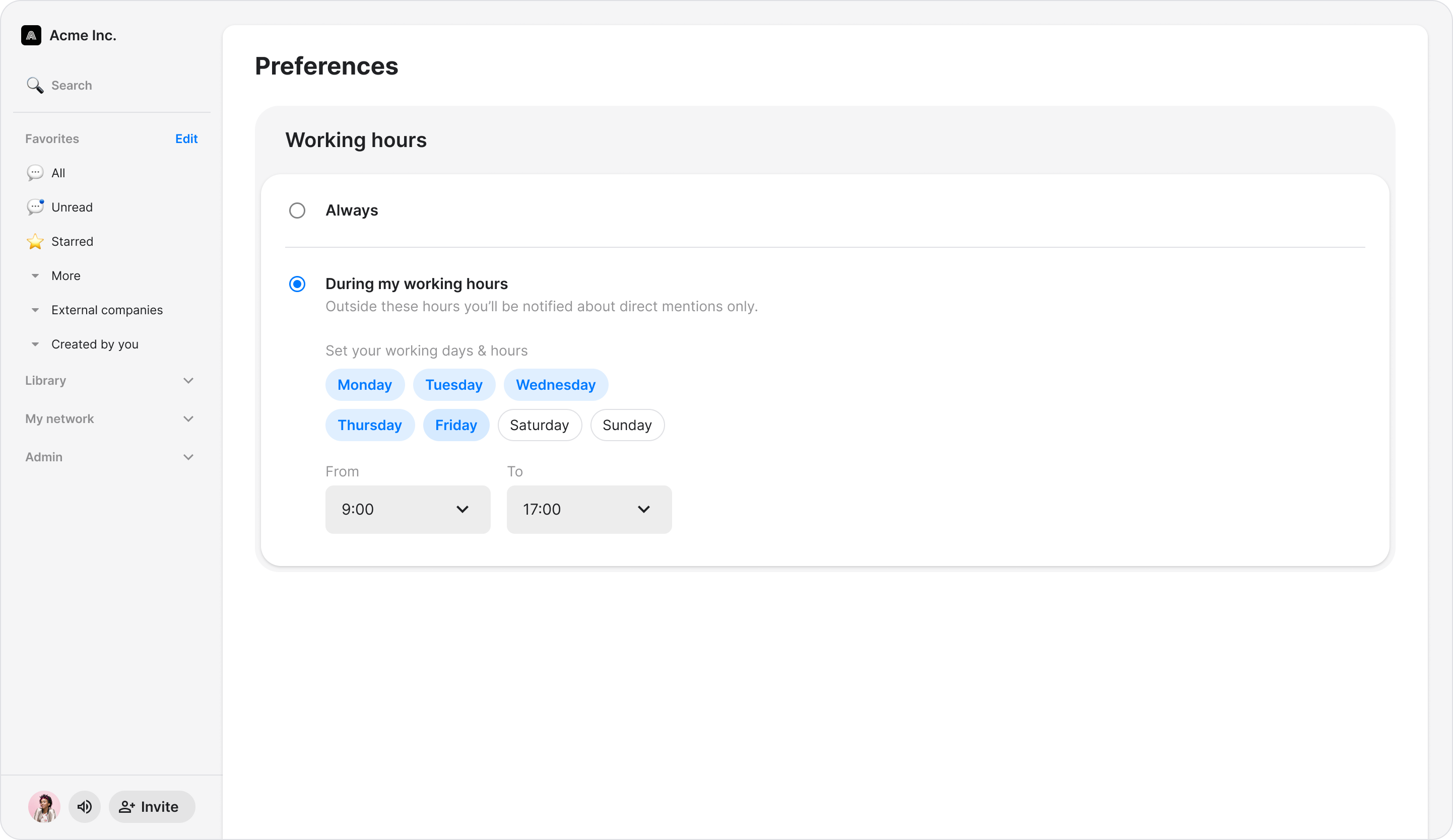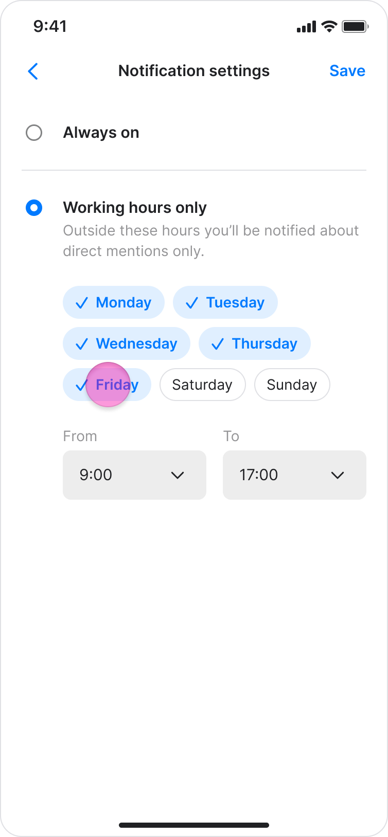 Maintain your work-life balance and reduce after-hours interruptions by setting working hours to control when you receive notifications. Important notifications for direct @mentions and replies to your messages will still come through.