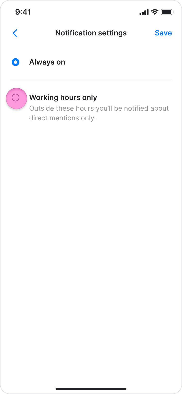 Note: To receive all notifications regardless of the time, select "Always on" instead of "Working hours only."