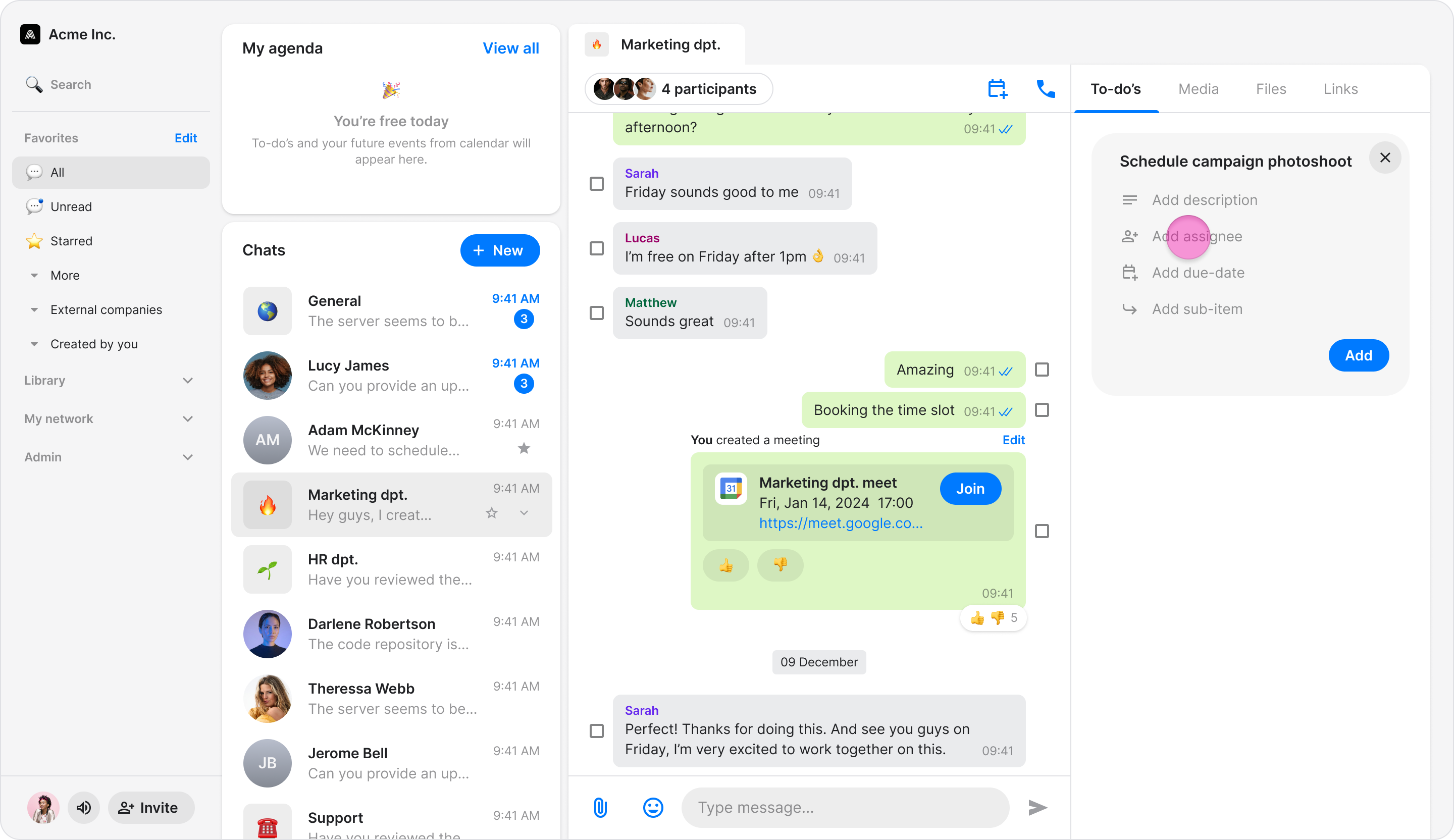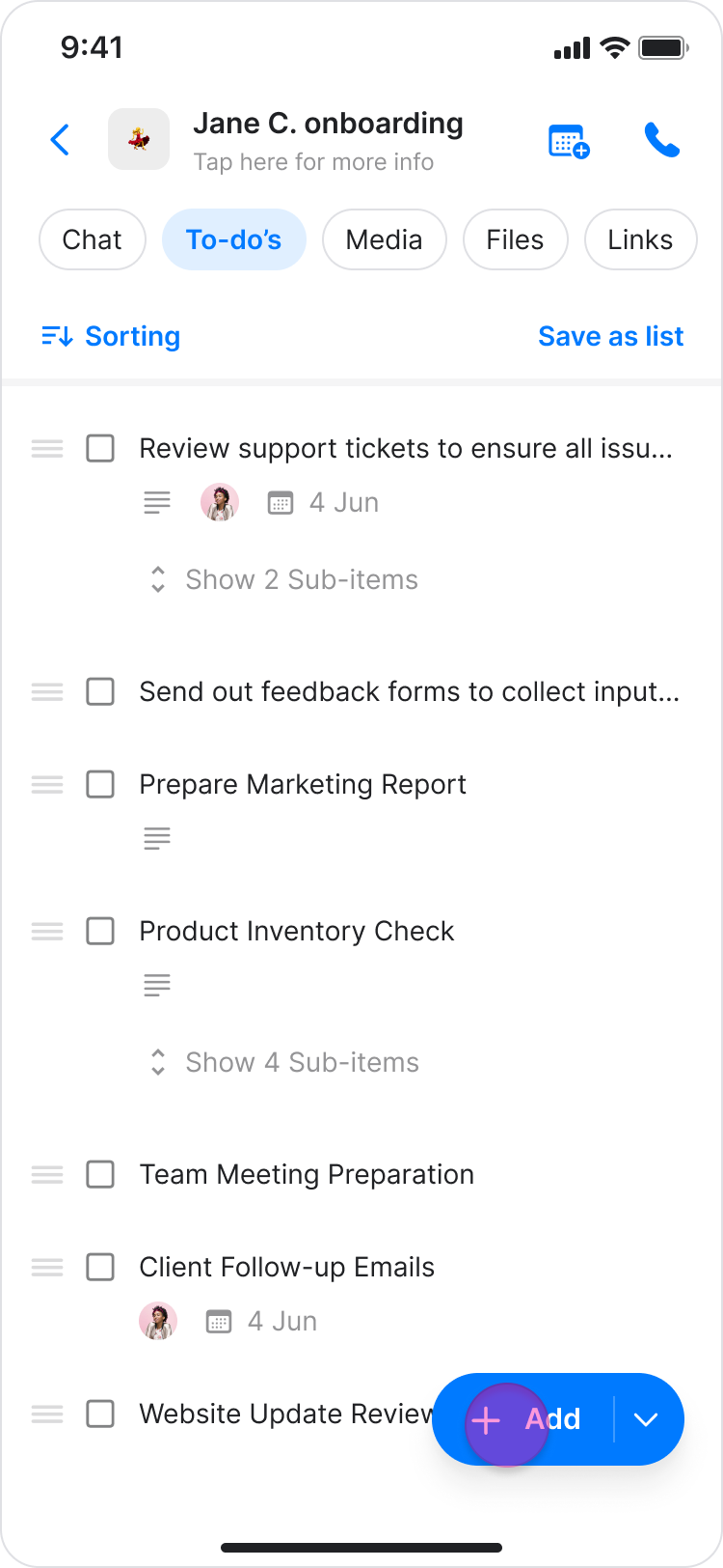 Keep your team's tasks organized and actionable by creating, assigning, and managing to-dos directly within any topic or group chat.